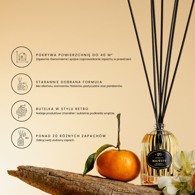 Wystarczy umieścić patyczki w butelce i pozwolić, aby zapach naturalnie się rozprzestrzeniał. Reguluj intensywność, dodając, usuwając lub odwracając patyczki.